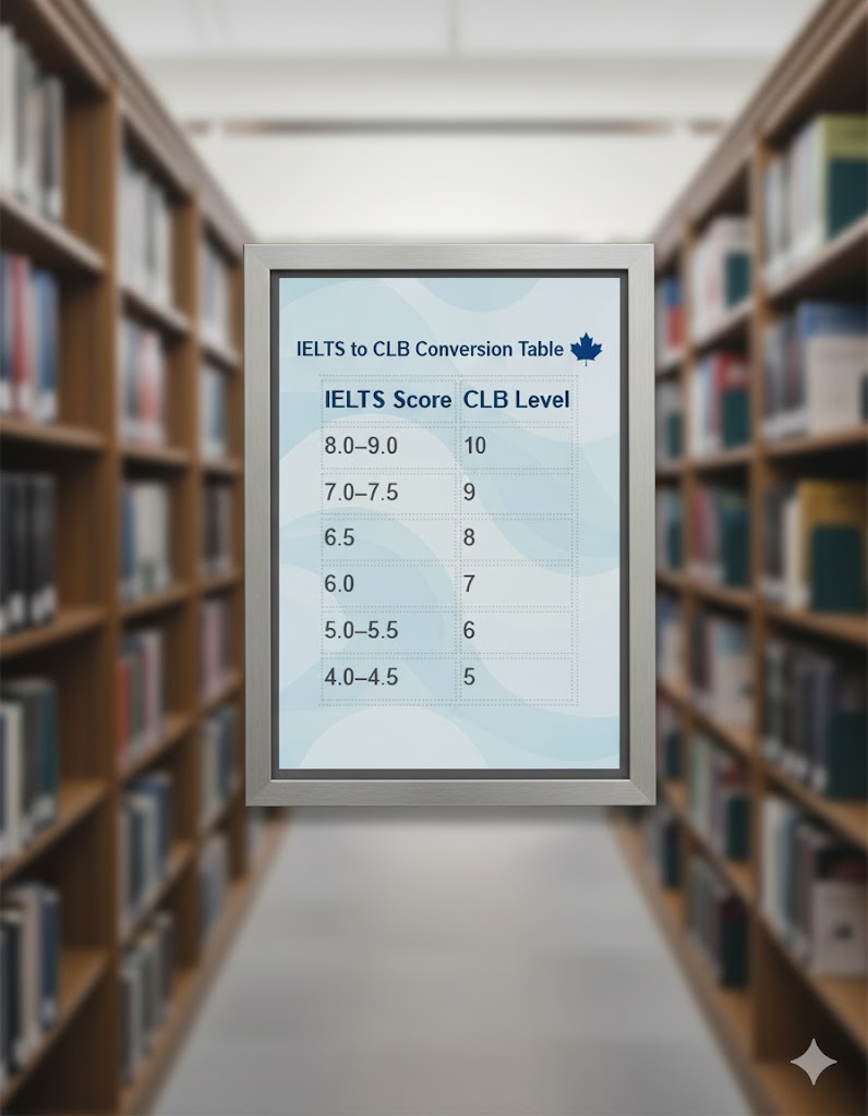 Each IELTS score corresponds to a CLB (Canadian Language Benchmark) level. For example: